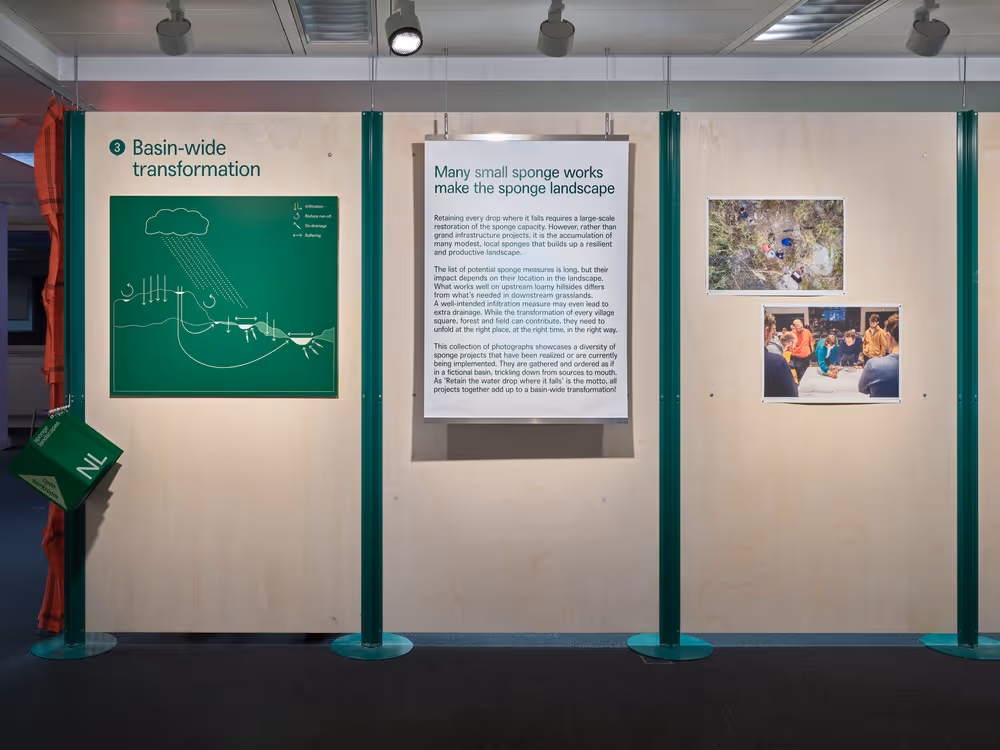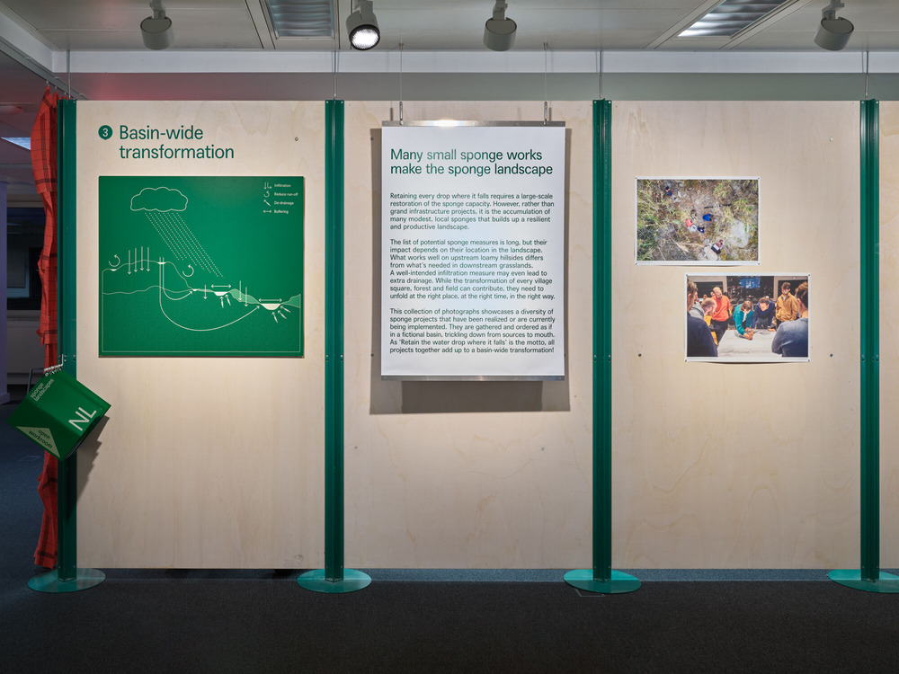 Doorheen de tentoonstelling wordt de sponswerking in een diversiteit aan landschappen verkend. Er wordt getoond hoe vele kleine maatregelen samen kunnen optellen tot een transformatie op schaal van het bekken, en wat we kunnen leren van bestaande gebiedscoalities. De open workroom en het bijhorend publieksprogramma maakt zo het portret van een praktijk in wording en roept op tot een missiegedreven en collectieve aanpak om Europese landschappen te hersponzen.